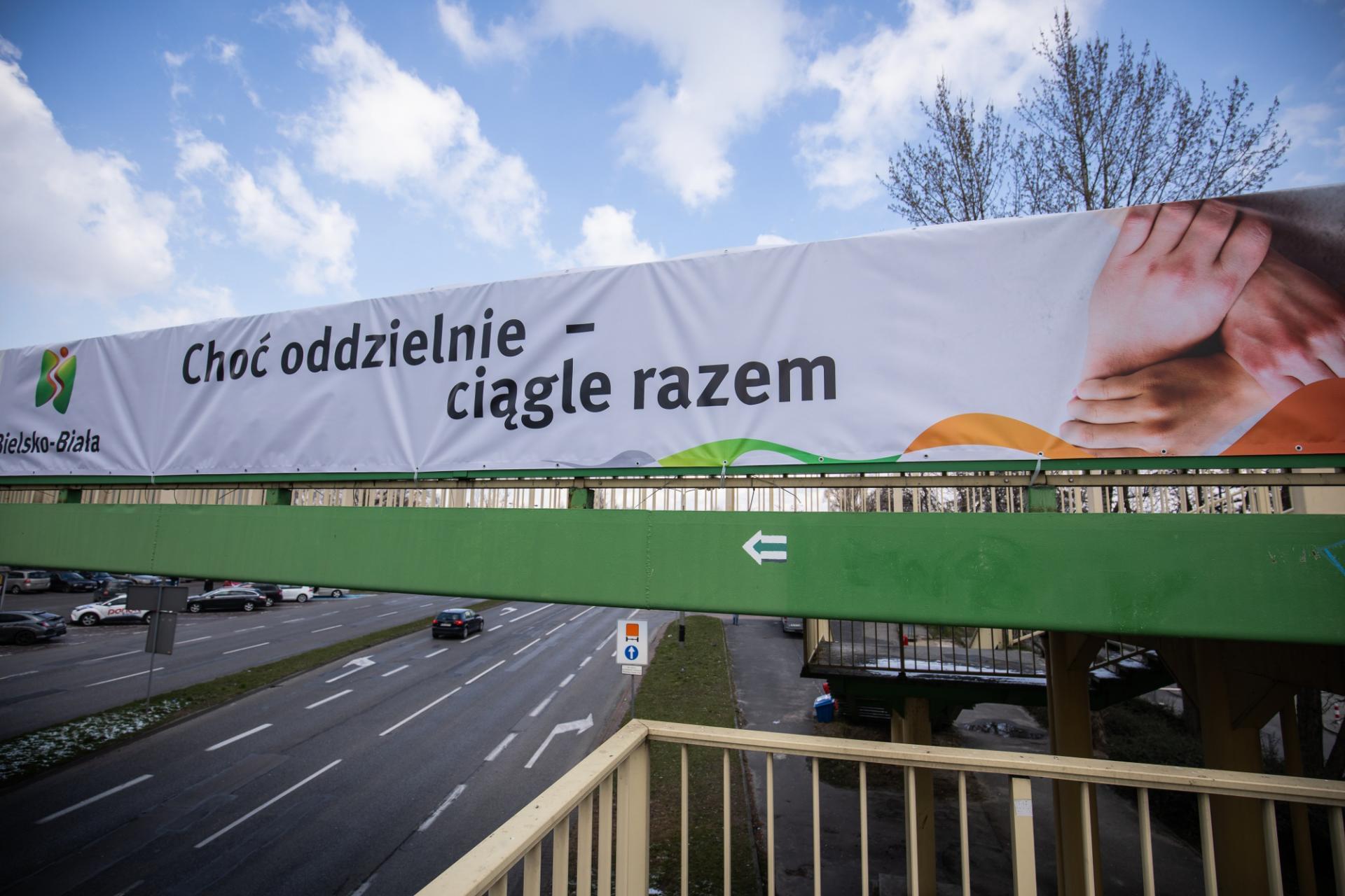 Ku pokrzepieniu serc mieszkańców na fasadzie bielskiego Ratusza zawisł baner:
