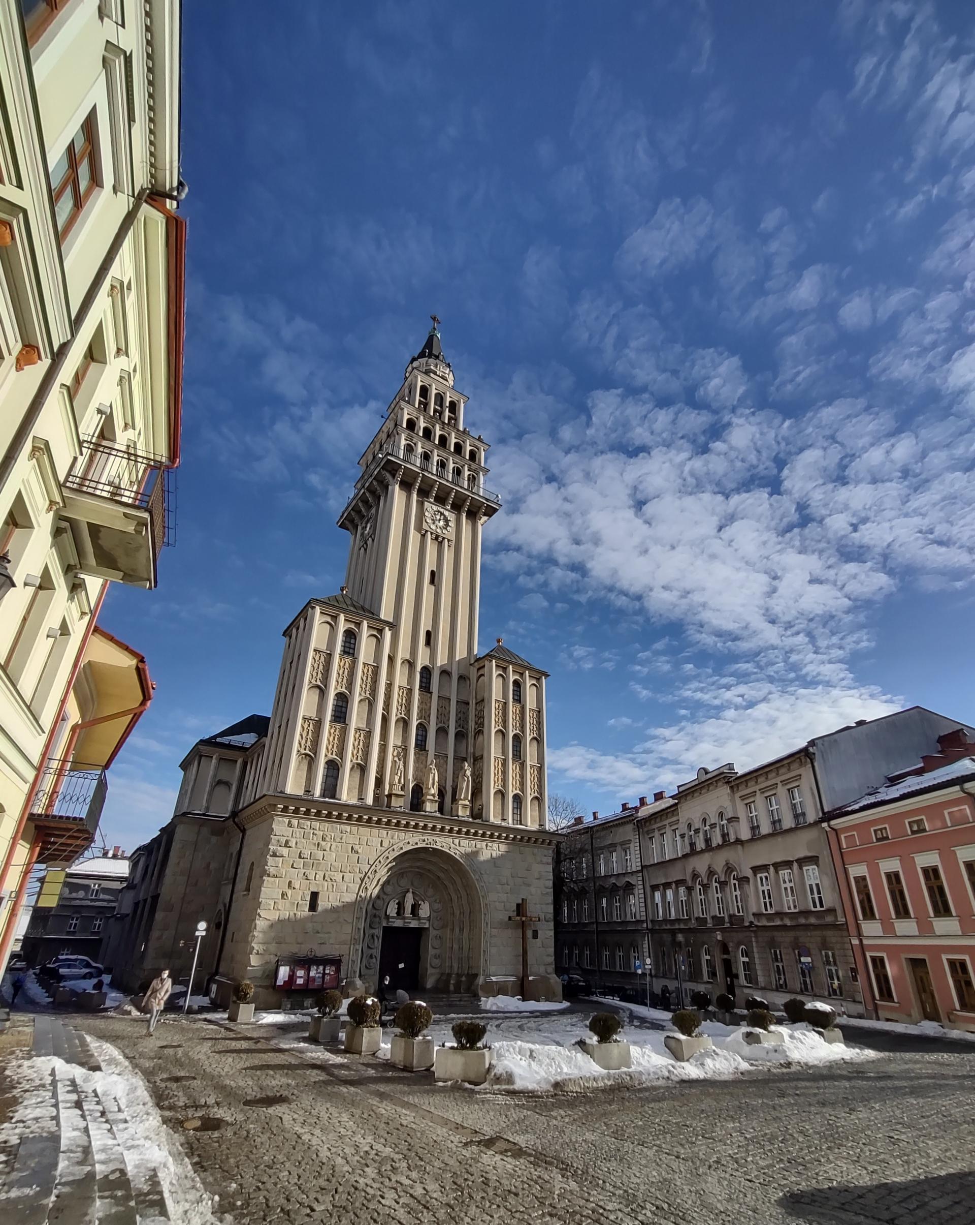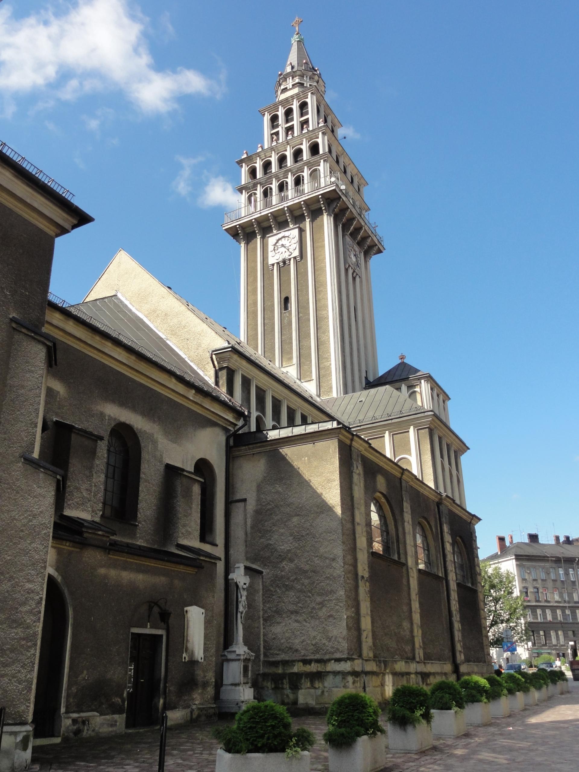 Historia i opis. Kościół gotycki zbudowany w latach 1443 - 1447 staraniem ks. Cieszyńskiego. Pierwotnie filialny wobec kościoła parafialnego pw. św. Stanisława bpa w Starym Bielsku (zob.), od ok. 1446 parafialny; wówczas jednonawowy o trójprzęsłowym korpusie, z węższym od korpusu, trójbocznie zamkniętym prezbiterium i zapewne wieżą od zachodu (w fasadzie). W latach 1559 - ok. 1630 zajęty przez ewangelików; ok. 1599 - 1608 dobudowa trójbocznie zamkniętej kaplicy po pn. stronie prezbiterium z fundacji właścicieli miasta Sunneghów. 1659 zniszczony w pożarze miasta i restaurowany staraniem Gottleba Sunnegha. Ponownie zniszczony przez pożar w 1750 r. W latach 1751 - 1756 odbudowany staraniem proboszcza Georga Entzeneorfera z barokizacją wnętrza kościoła gotyckiego i przekształceniem elewacji. Niszczony pożarami 1808, 1836, 1860; 1830 zawalenie się wieży; restaurowany m.in. za rządów proboszcza Mateusza Oppolskiego (1828 - 1850) po poł. XIX w. budowa prostokątnych aneksów przy prezbiterium, z ukształtowaniem klasycystycznych elewacji. W 1885 r. remont wieży z budową wysokiego hełmu, znanego z ikonografii; 1894 wykonanie witraży przez firmę C.L. Turcke z Pragi. 1908 - 1910 r. gruntowna przebudowa i rozbudowa wg. proj. arch. Leopolda Bauera z Wiednia): rozebranie dawnej fasady z wieżą, dobudowa obecnego korpusu trójnawowego; jednocześnie wykonanie wystroju rzeźbiarskiego fasady (Othmar Schimkowitz z Wiednia) oraz witraży w nowym korpusie (proj. Rudolf Hartfinger z Wiednia), uporządkowanie otoczenia. W 1992 r. kościół mianowany katedrą diecezji bielsko - żywieckiej.