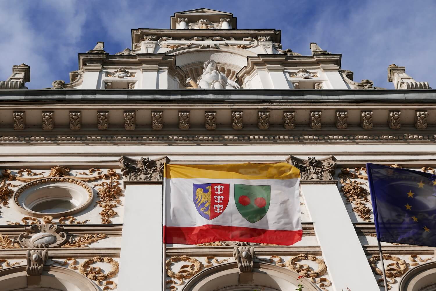 Na Honorowej fladze Miasta Bielska – Białej znajdują się herby Miasta Bielska-Białej,